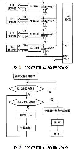 石油產品閃點溫度下的閃火火焰的存在時間是閃點檢測儀表電路設計的重要參數(shù), 為測出火焰存在時間, 筆者利用 AT89C51 制成一臺火焰存在時間檢測裝置, 其電路簡圖如圖 1 所示, 主要流程圖如圖 2 所示。