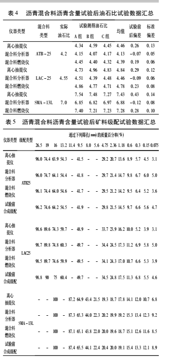 和表 5 中將此三種儀器分別簡寫成離心式瀝青抽提儀、混合料分析器、混合料燃燒儀) 將拌制好的瀝青混合料進行瀝青含量抽提試驗,試驗結果見表 4、表