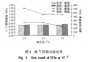 (1)在油石比、 級(jí)配完全相同的情況下, 泡沫瀝青冷再生混合料 15 ℃劈裂強(qiáng)度略高于乳化瀝青冷再生混合料 , 且均滿足文獻(xiàn) [ 11] 中熱拌粗粒式瀝青混凝土的強(qiáng)度范圍。例如, 油石比 2.5 %時(shí) , 泡沫瀝青冷再生混合料 15 ℃劈裂強(qiáng)度為 0.71 MPa , 略高于乳化瀝青冷再生混合料的0.69 MPa , 且均滿足密級(jí)配粗粒式瀝青混凝土 0.6 ~ 1.0 MPa 的 15 ℃劈裂強(qiáng)度范圍。