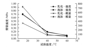 采用 2.0 %的油石比制備試樣 , 分別在 15 、 40 、 60 ℃條件下進(jìn)行劈裂試驗(yàn), 試驗(yàn)結(jié)果如圖 6 所示。從圖 6 中可以看出, 40 ℃和 60 ℃條件下, 泡沫瀝青冷再生混合料劈裂強(qiáng)度分別為 0.18 、 0.09 MPa , 僅為
